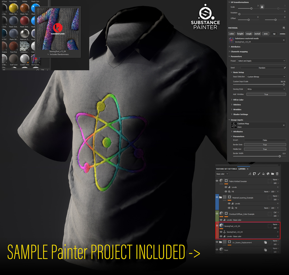 • Basecolour has a Mask embedded so you can apply effects over the stitches only accessing the basecolour using the ANCHOR (Check the example file);