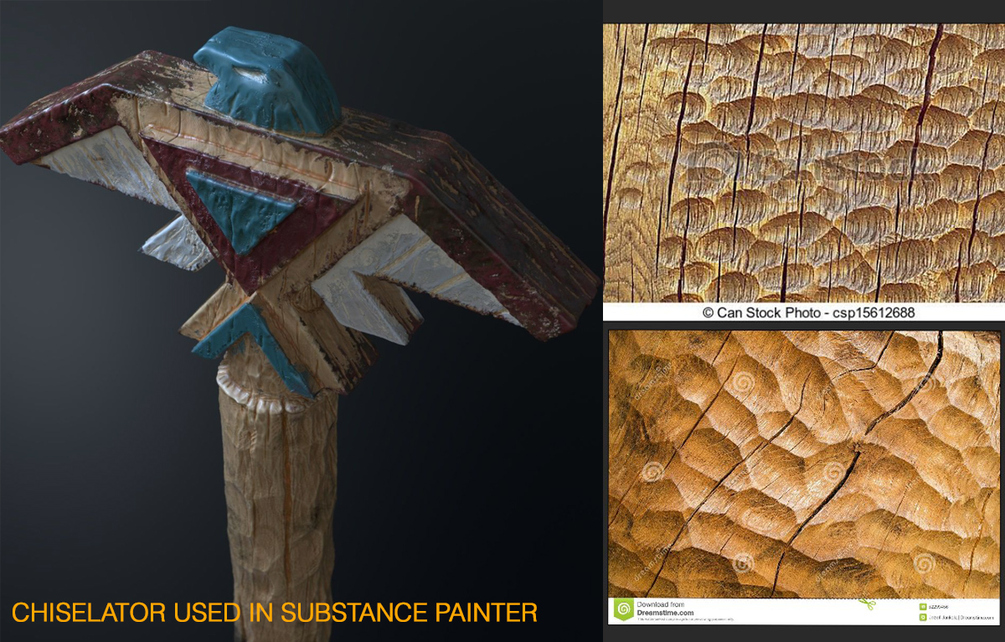 Chisel Generator tool. You can carve "digitally" your wood sculptures on Substance Painter using this with a painted mask over other Wood textures for a better effect. You can use the original SBS project to Study, or the SBSAR on any software that supports it, like Maya, Max, C4D, Unreal, etc.